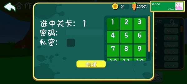 5、挑选关卡,设置好密码,决定是否创建私密房间,全部操作完成后点击“创建”。