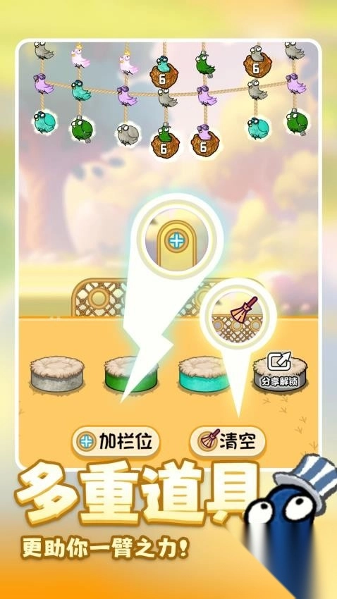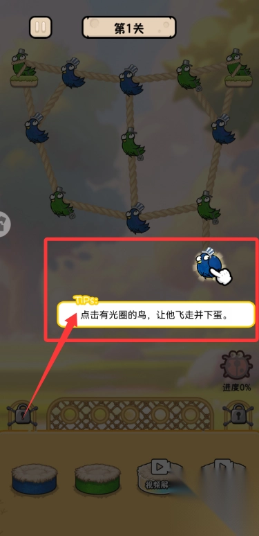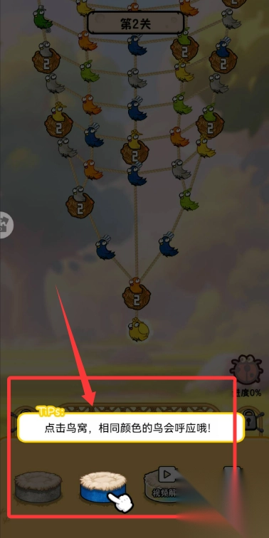 3、后续关卡遵循界面提示,灵活点击鸟和鸟窝,利用飞离下蛋同色呼应的规则,即可通关。