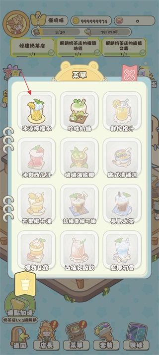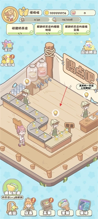 3、轻点店内的灯泡标识,着手推进经营任务(比如修建奶茶店),进而提升店铺等级。