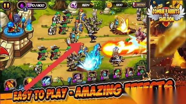 2、战斗中,指挥箭头指向的部队,释放技能(如蓝色魔法),打击僵尸兔,保护己方阵地。