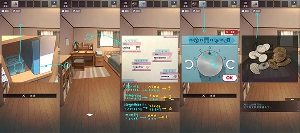 回到家在书架上取得存钱罐,依照墙上单词的提示打开存钱罐拿到零钱。