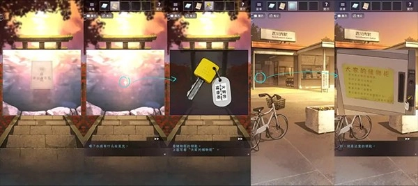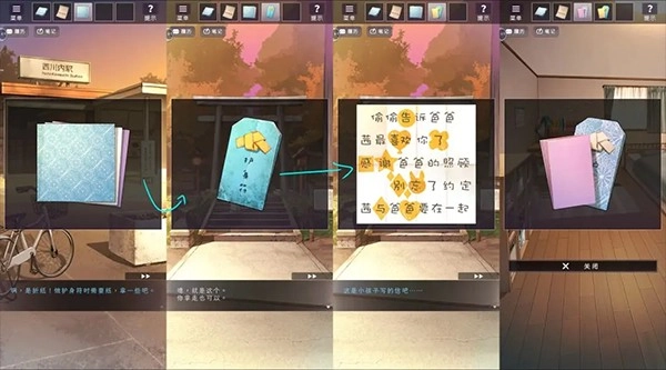 前往后山将福纸泡水得到图案,调查水中发光点得到储物柜钥匙,前往车站打开储物柜得到折纸。