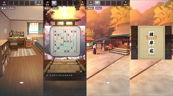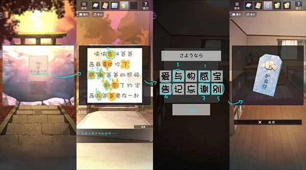 回到卧室,在桌面上取得手帕,打开后可发现上面有字;与幽灵对话得知“需要同时看正反两面”,前往后山将手帕泡水,显现出字。之后前往神社祈福,调整祈福为“彼岸花”,得到福纸。
