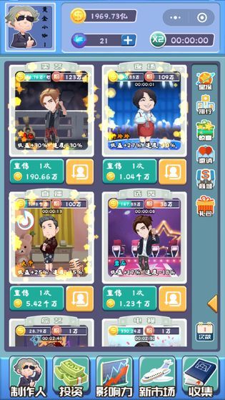 1、聘请职业经纪人帮助你,在离线的时候也会自动的运转,离线收益可以通过看广告翻倍。