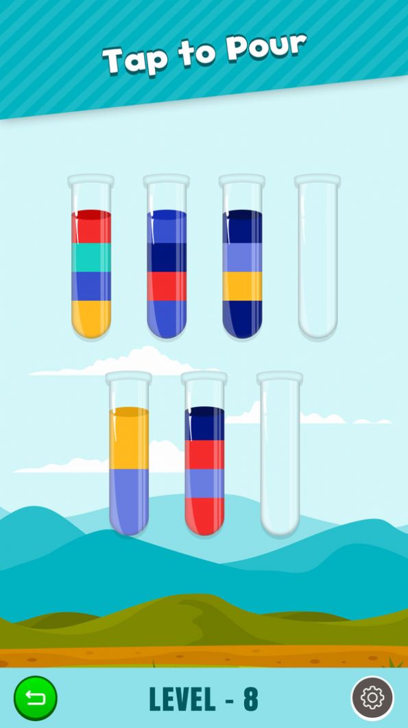 不同颜色的液体分在不同的试管中,这个游戏玩起来很简单,玩家也很容易上手,游戏中有很多玩家可以体验不一样的难度挑战,