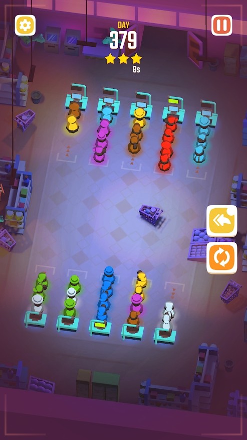 游戏内的玩法十分的考验大家的思维能力,通过点击来控制这些不同颜色的小人进行位置的变换,并最终能够将相同颜色的小人放置在同一个地方。