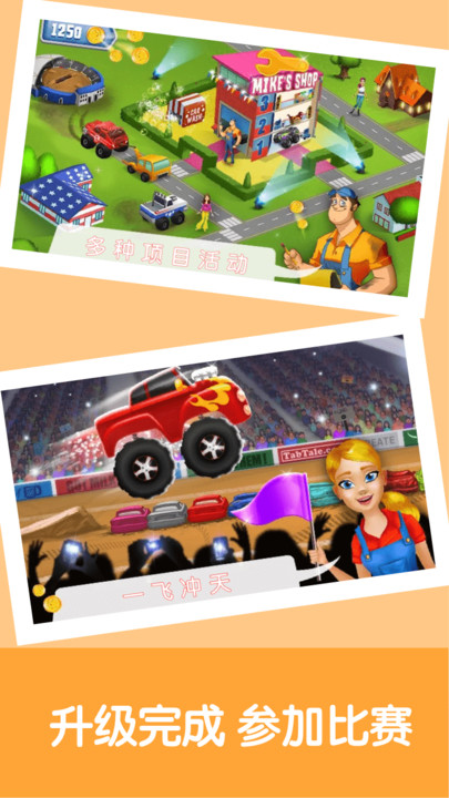 1、4种怪物卡车可供选择,3个车库级别,可解决所有机械问题。