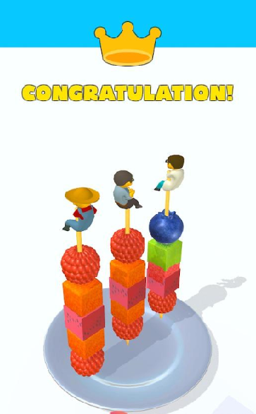 3、也会考虑竹签的是否断裂的问题,特别在串着比较大比较硬的水果时,直到把所有食材串到竹签子上才能装到盘子里,至少要穿三串才能过关。