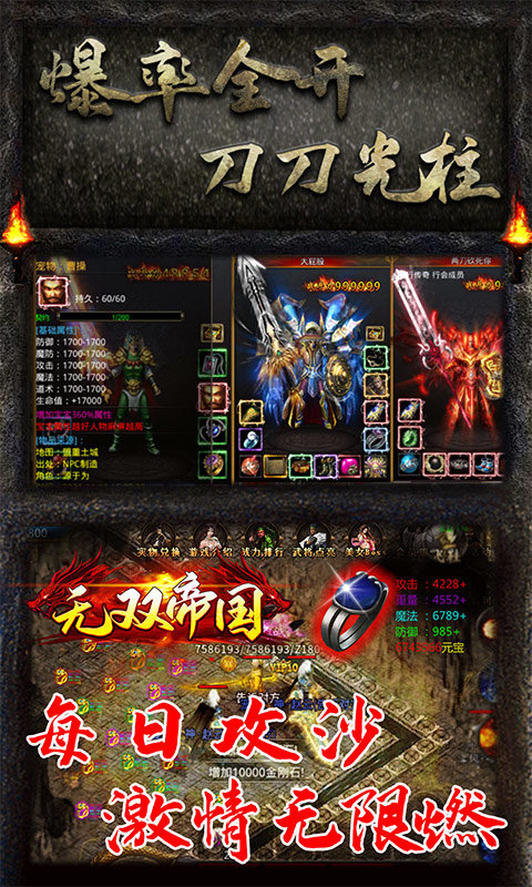 无双帝国是一款画风十分真实的手机游戏,全新的副本攻沙冒险之旅带给你,搭配全新的策略,十分独特的军团战争带给你,你可以更好更轻松的进行冒险,在这里进行战斗也非常的不错,跨服战斗更轻松,十分优质的冒险在这里等你,集合了全新的武器神装,喜欢的小伙伴们不要犹豫了,快来下载无双帝国体验一下吧!