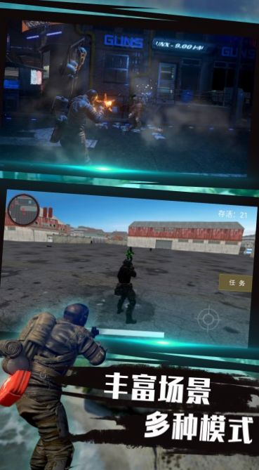 1、枪战比拼,生存考验,诸多任务,海量玩法,自由挑战;