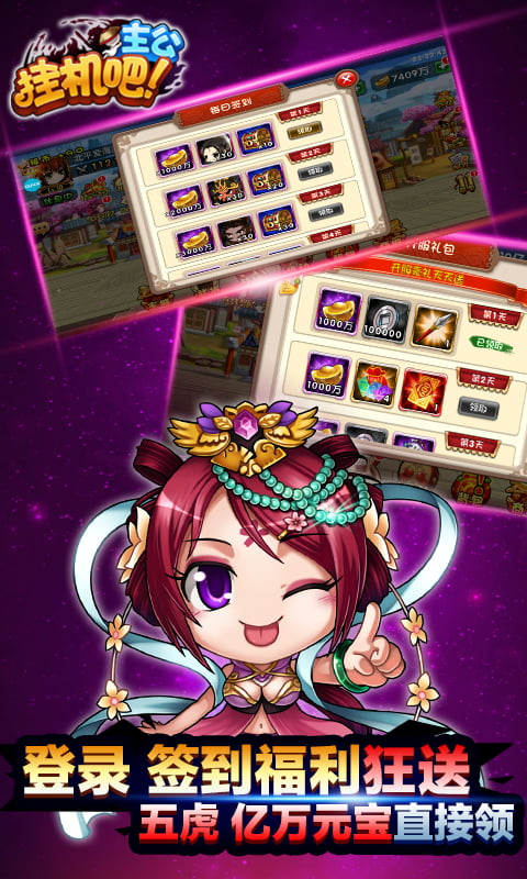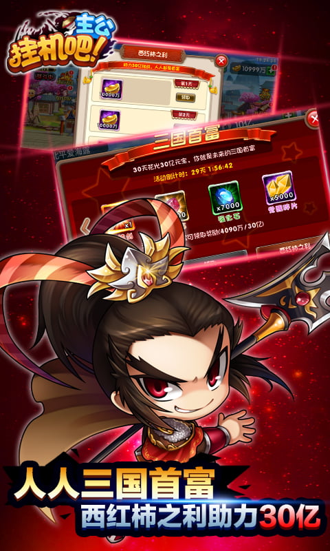 【挂机吧主公】西红柿首富是一款精彩炫酷的三国卡牌放置游戏,经典的闯关游戏内容让每一个玩家都可以畅爽在游戏中完成一系列精彩趣味的任务,随时随地挂机升级。畅爽的获得精彩绝伦的奖励,自由自在的在游戏商店中获得购买自由,轻松的成为首富,每一天都可以领取一亿元宝!畅爽的让你直接起飞!开开心心快快乐乐的展开自由自在的冒险!开启属于你的挂机之旅吧!