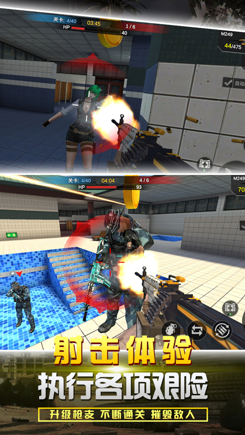3、多种射击玩法带来最好的闯关体验,进入不同地图中疯狂射击,击杀所有的敌人。