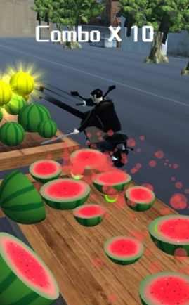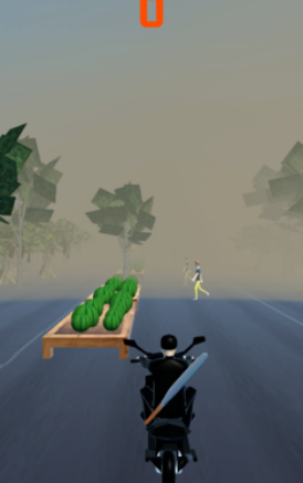 2、我们要骑着摩托车去跑酷,同时还需要将路边摊的西瓜给疯狂劈砍破坏掉;