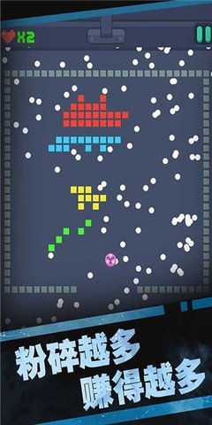 2、玩家不断地将其像素快速击碎的时候将会获得更多的小球,如果连续将大量的方块击碎还有分数。