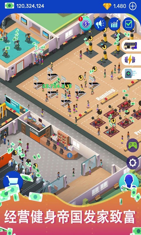 房帝国大亨,趣味健身房经营游戏。开局一个超大健身房经营,各项跑步,瑜伽,动感单车,拳击等项目开启,召集运动员教练,完成一个个科目练习,完善经营你的健身房。