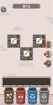 1.点击相同的方块,三个相同的方块就能进行消除,并将他们丢进合适的垃圾桶中,完成关卡挑战。