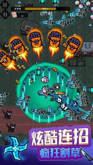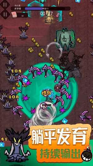 1、在游戏中体验最刺激的割草玩法,快速升级武器和技能,直接秒杀一大片的敌人。