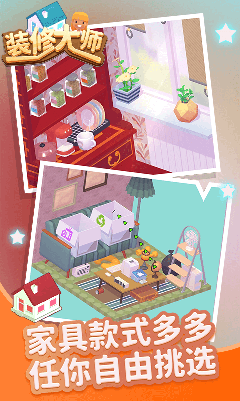 装修大师游戏,画风温馨的家园装修小游戏,这里玩家通过完成各种任务解锁不同风格的家具来装修你的小家,不同的卧室、厨房、客厅等房间任你装修,打造你的温馨小家吧。