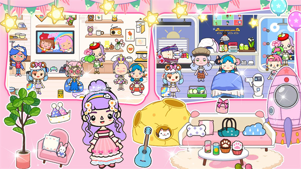 1、在小镇中自由探索,收集场景中的所有物品,自由搭配,装扮你的房间,和各种NPC互动玩耍。