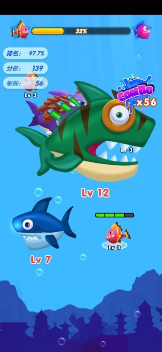 3、这是一款不走套路的大鱼吃小鱼的游戏,比起复古版本多加了很多全新的元素,尽情体验吧。