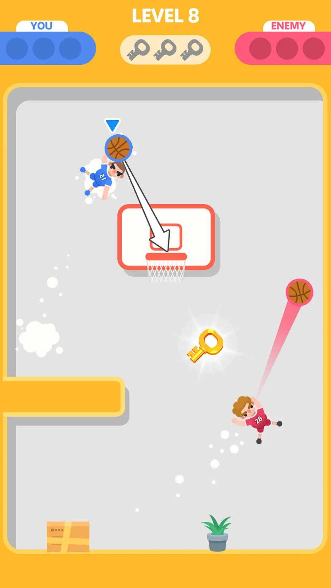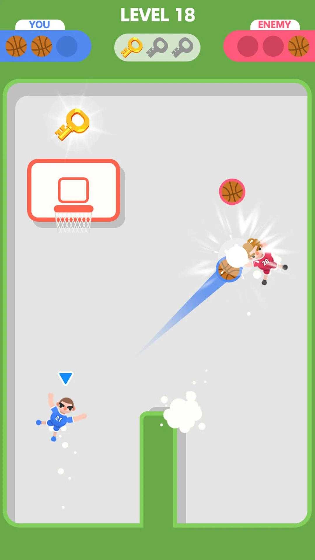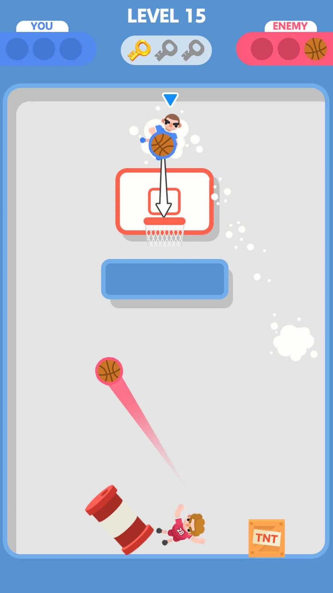 愉快的蓝球战斗是一款非常精彩有趣的篮球闯关小游戏,在游戏中你需要控制你的人物在各种奇葩的关卡中将篮球投入到篮筐之中