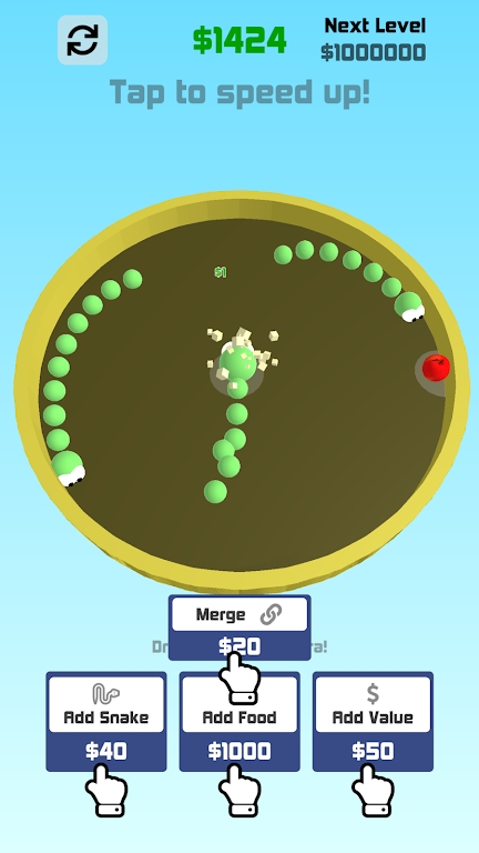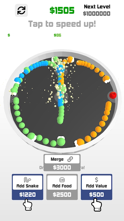2、并招换两只相同的小蛇进行融合变成下个等级的小蛇,再依次进行相同玩法升级;