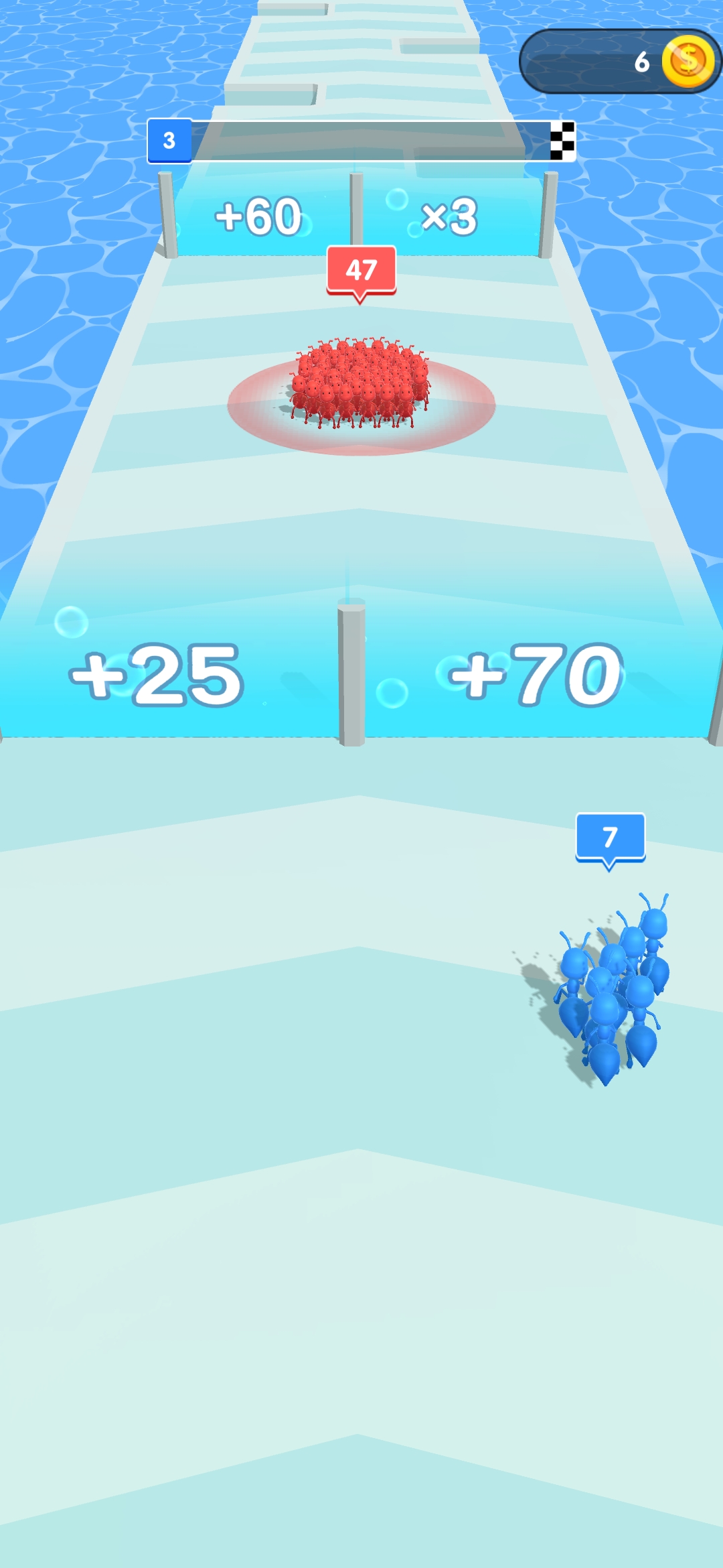 指挥你的蚂蚁通过蓝色翻倍门来增加它们的数量,同时记得避开危险的红色门。