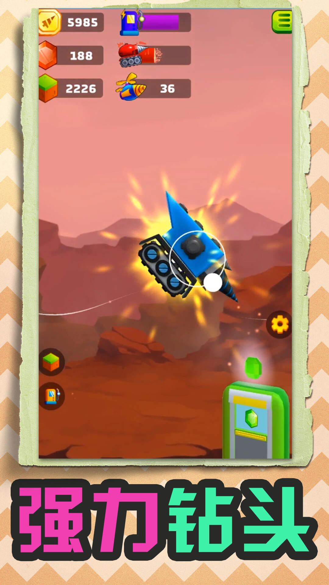2、按箭头按钮控制钻机方向,躲避岩浆块,挖得越深奖励越多;