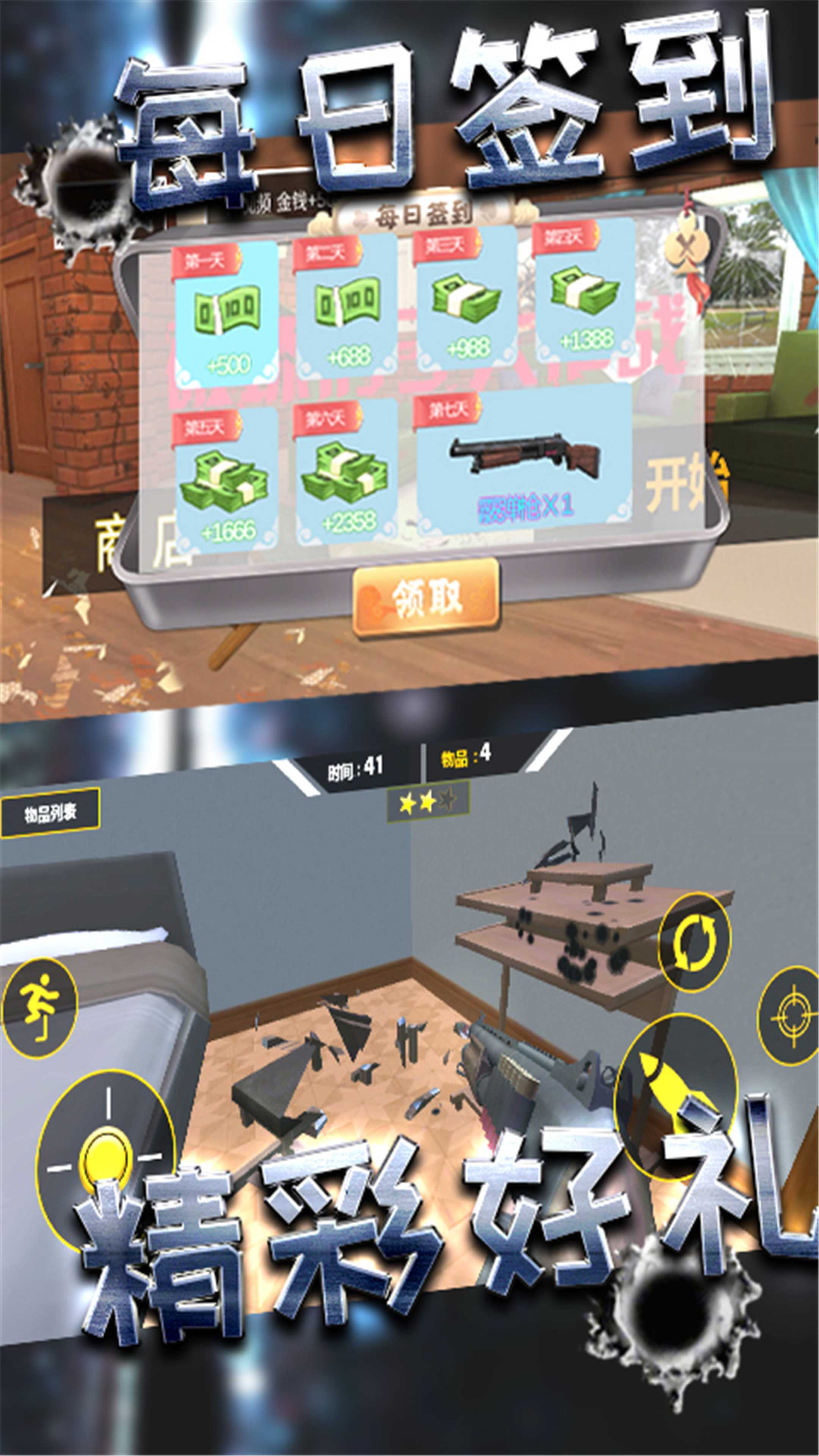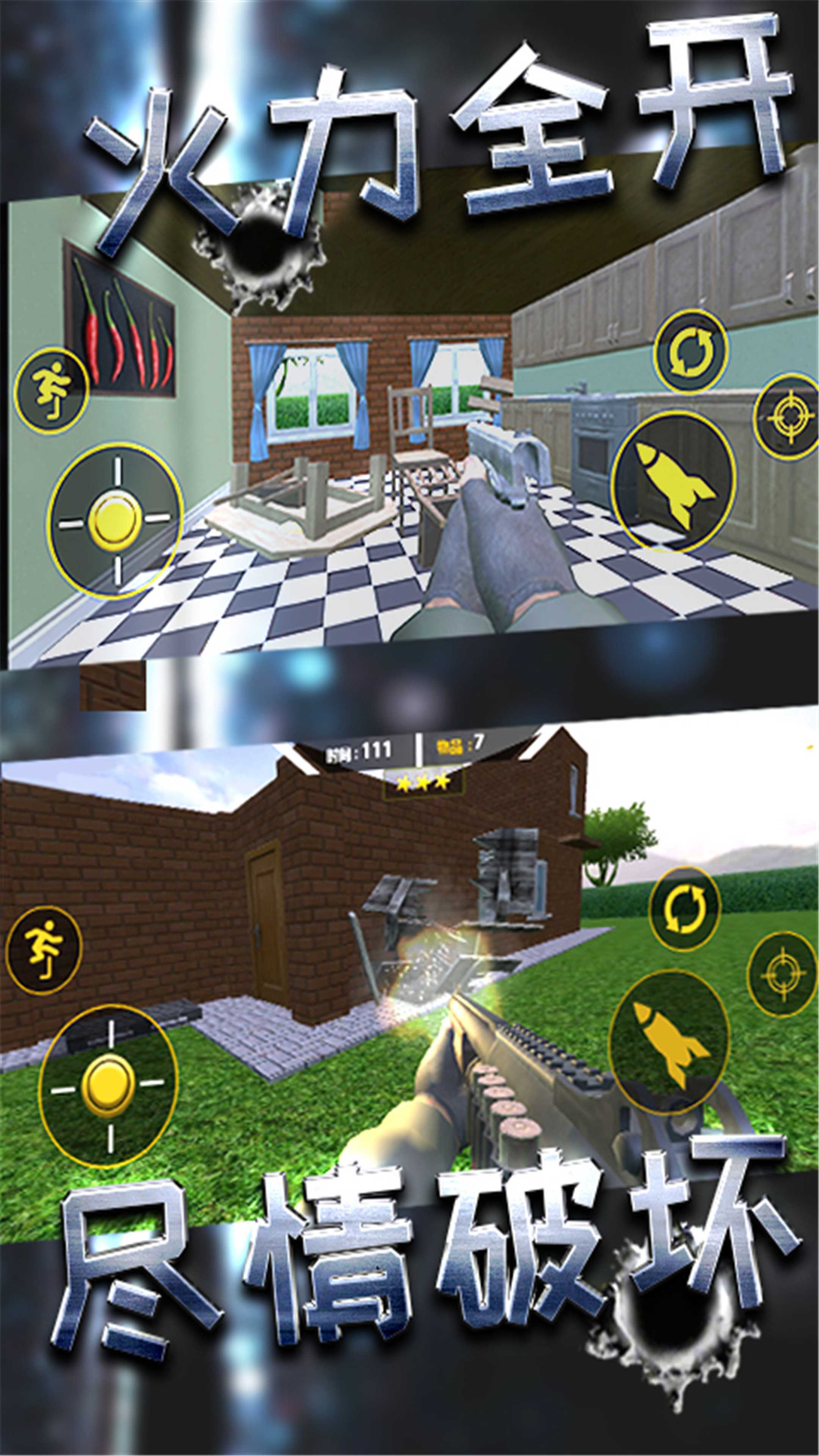 此游戏是家庭室内粉碎游戏,摧毁房子里面的饰品,在不停的射击中感受不一样体验。用你的枪支来享受摧毁房屋的快感,并可以从中释放压力、缓解压力。