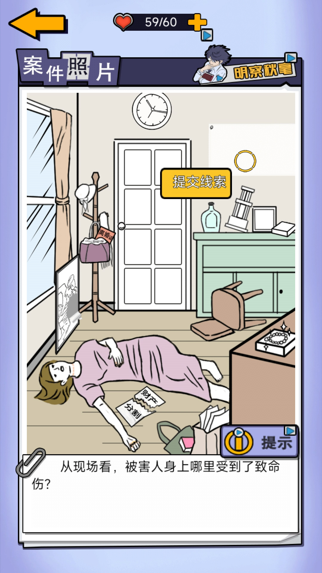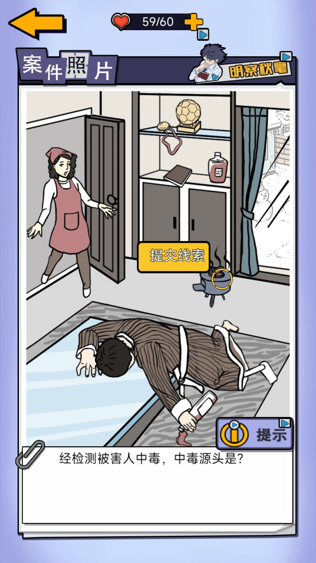 让我们和名侦探一起开始侦查案现场的谜题。根据案发现场的系统提问找到破案的线索,