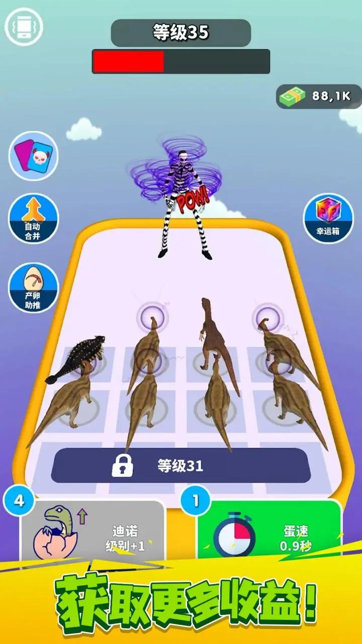 继续合并能让恐龙不断进化,如凶猛的霸王龙,悠闲的草食龙,遨游天空的飞龙。