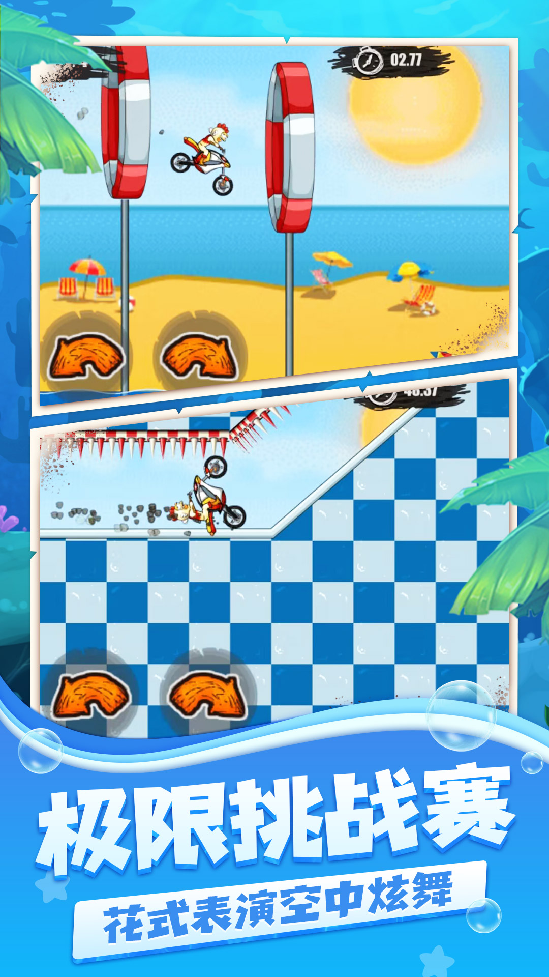2.玩家需要通过控制摩托车进行跃起、下降和加速等操作来避免抵达地点。