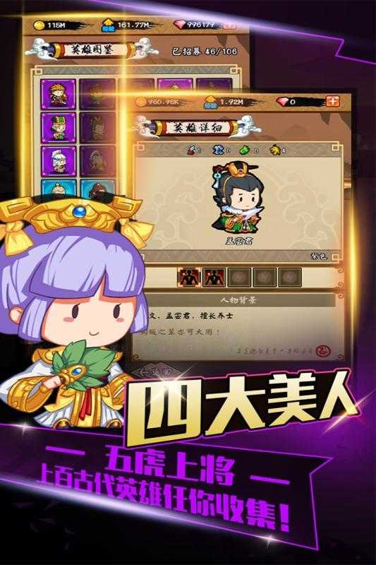 百将江湖手游是一款Q版中国风动作放置类RPG手游。游戏玩法采用冒险探索的玩法,酷炫的技能释放,玩家可以在游戏中收集各朝各代总计超过200位古代著名英雄任意搭配,加上神秘莫测的寻宝探险系统和故事副本,伴你愉快地度过闲暇时光。各具特色的英雄名将,炫酷华丽的技能组合,趣味策略的阵容搭配,惊喜不断的寻宝探险,简单挂机就能轻松升级,精彩历程只等你来开启!赶快来下载体验吧!