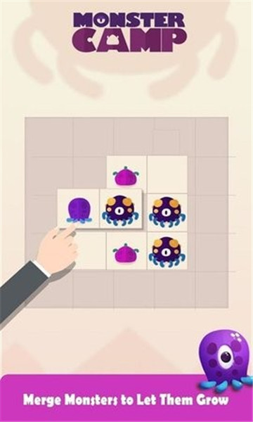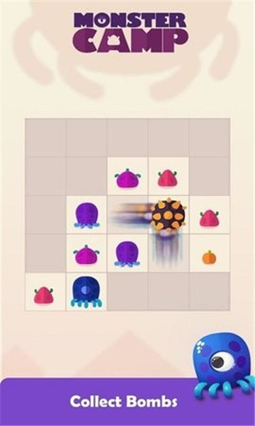 拖动出现的元素放置于地图上,三个及以上横竖相连的同种小怪物会合并成长,直至最后合成你的怪物炸弹